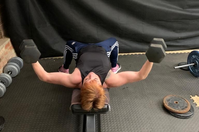 1. Lie with your head and shoulders supported by the bench and your feet flat on the floor. Hold the dumbbells directly above your chest, palms facing each other.